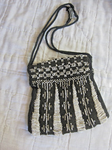 VINTAGE BLACK AND WHITE BEADED PURSE WOMENS ANTIQUE ART DECO FLAPPER GIRL BAG