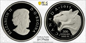 2011- Canada 1oz Platinum Cougar $300 Coin- PCGS PR69 DCAM