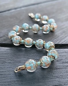 Venetian Glass Robin's Egg Blue Copper Gold Foil Bead Bracelet 7.5" Hand-knotted