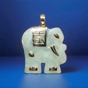 14k Yellow Gold Carved Jadeite Jade Green Lucky Elephant Pendant 1" Vintage