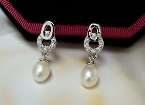 18KGP White Gold CZ Inlay Oval Shaped Pearl Drop Earrings