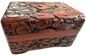 Vintage Chinese Loong Dragon Carved Camphor Brown Trinket Red Velvet Jewelry Box