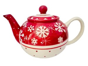 Holiday Home Ceramic Serving Tea Pot Lidded Hand Painted Snowflakes Red White