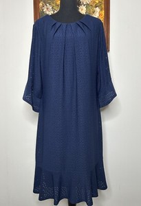 London Times Straight Dress Women's 16 Smocked Neck Flared 3/4 Sleeve Navy Blue