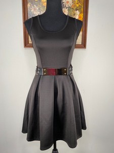 Wet Seal Fit & Flare Dress Women's Small Black Round Neck Back Keyhole Belt USA