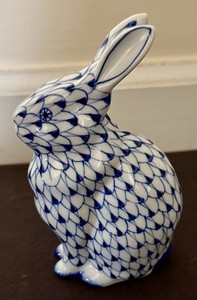 Vtg Andrea by Sadek Porcelain Sitting Bunny Blue & White Fishnet Pattern 5.5"