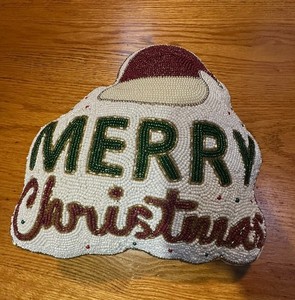 Merry Christmas Holiday Beaded Throw Pillow Santa Hat Decor 10”