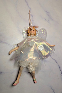 Fairy Christmas Ornament White Satin Feather glitter wings, Pink Shoes 6.5” Tall