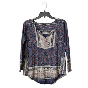 Lucky Brand Top Women's Size S Blue Knit Floral Boho V-Neck 3/4 Sleeve Cotton