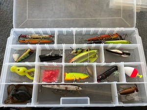 VTG Lot of 16 Crankbait Fishing Lures Case Pico Perch Penn Dart Frog Wood
