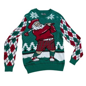 Ugly Christmas Argyle Santa Golfing Sweater Men's Size Large Green Cotton Knit