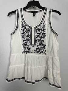Style & Co Petite XL White Sleeveless Tunic Top Navy Blue Embroidery Boho
