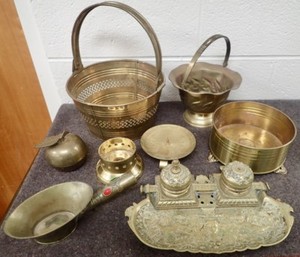 Lot of Vintage Brass Planters Apothecary Scoop Candle Holders & Antique Inkwell
