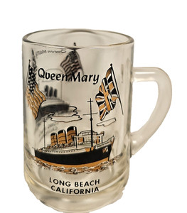 Queen Mary Long Beach, CA. Glass Souvenir Coffee Mug 5"x 5" Black & Gold Design