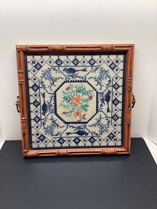 Vintage Cross Stitch Hand Made Wood Glass Serving Tray Bluebirds Flowers EUC $49.99Extra 20% off with coupon