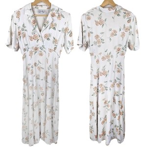 Vintage Floral White Sundress Midi Fit n Flare Collar Button Front Cottagecore S