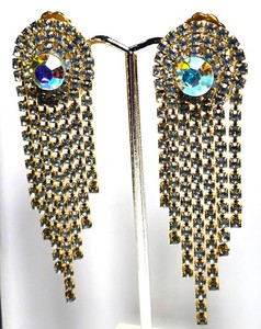 Vintage Art Deco Aurora Borealis Rhinestone Fringe Waterfall Clip-On Earrings