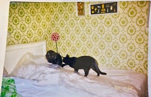 Vintage 1997 4x6 Found Photo 2 Black Cats on Bed in Yellow Wallpapered Bedroom