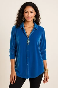 Soft Surroundings Cobalt Blue Velvet Boyfriend Tunic Button Down Shirt Sz Large