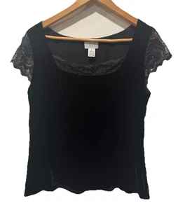ANN TAYLOR LOFT BLACK VELVET SILK BLEND TOP WITH LACE TRIM Y2K SZ 12