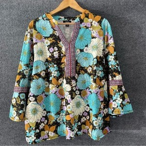 Talbots Womens Embroidered Floral Boho Top Size XL Blue V Neck Long Sleeve