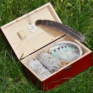 Wooden Box with 2 White Sage, Pentagram Pendant Necklace, Abalone Shell, Feather