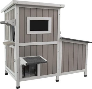 PetsCosset Outdoor Cat Shelter Two Story Wooden Cat House with Roof,Grey