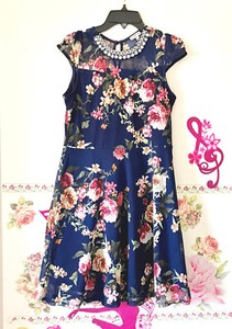 Monteau Girl Navy Blue Rose Floral Dress Girls XL 14