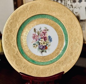 ANTIQUE Hutschenreuther Bavaria 24kt Gold Encrusted Green Floral PORCELAIN PLATE