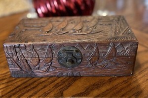 Antique Hand Carved Wood Relief Hinged DRESSER BOX Latch Junk BoatsChinese Qing