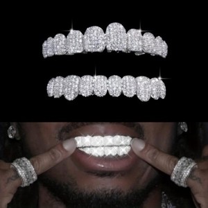 A Set Teeth Grillz Top Bottom White Gold Plated Hip Hop 5A+ ICED CZ Out Grillz