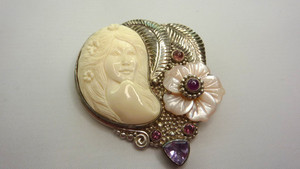 Vintage Sajen Carved Woman Amethyst Sterling Silver 925 Pendant/Pin