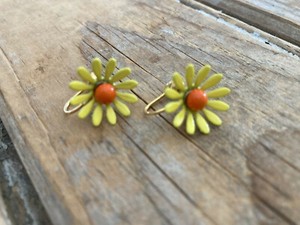 Vintage Enamel Clip Earrings Dainty Yellow Daisies 1960s Mod Jewelry .5+ in dia