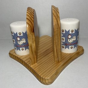 Vintage Country Rooster Salt & Pepper Shakers, Wooden Napkin Holder • Farmhouse