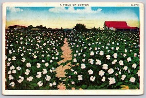 Postcard Southern U.S. Cotton Field and Barn with Red Roof c1920s
