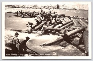 Postcard RPPC Men 'Working a Log-Jam' on the Priest River in North Idaho c1940s