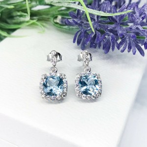 Cushion Natural Blue Aquamarine & Diamond Halo Stud Earring 14k Solid White Gold