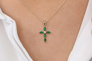 1ct Natural Emerald & Diamond Pendant Holy Cross 14k Solid Yellow Gold NO CHAIN
