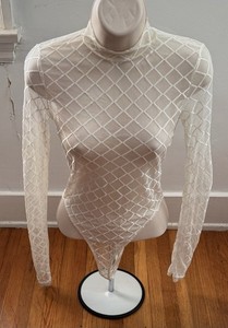 Women’s White Mesh Geometric Long Sleeves Bodysuit, Size S Turtleneck Y2K Boho