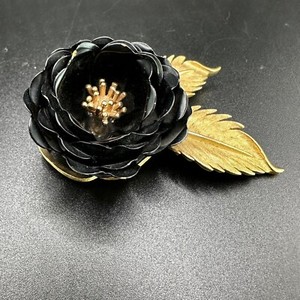 Crown Trifari Black Enamel Rose Brooch Gold Tone Leaves Pin 3 Inches Signed