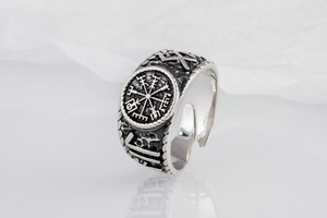 Sterling Silver Vegvisir Symbol Ring with Hail Odin Runes Handmade Norse Jewelry