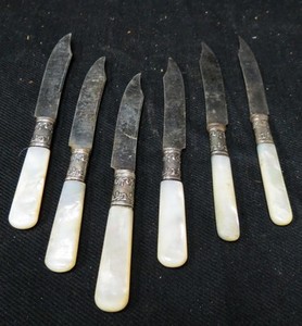 (6) vintage Mother of Pearl fruit knifes w/ sterling silver bands / AETNA WORKS