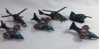 Currently used for BattleTech, these die-cast models are a near-perfect fit for all things 6mm. The propellers and VTOL props may be positioned with ease (are not too loose) and a little nub on the bottom (not pictured) is a non-invasive way to mount the craft on a post or raised platform. (The models are free-standing on mold-made landing struts or tank treads). Very well made and sturdy.