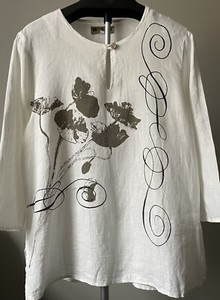 Studio Produce Womens Linen Cream Top Medium 3/4 Sleeves Poppy & Scroll Print