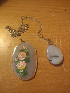 Vintage Stone Goldtone Necklace & Rose Painted Pendant