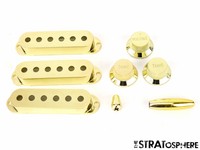 The pickup covers only fully covered one of my pickups. I don't know who to blame (let's go with me.) but after some drilling so that it would fit the other two look nice enough. The plastic wammy bar tip broke while trying to push it in(maybe my fault). The pot knobs look a little cheesy but they're alright cause you can see it in the picture from the get-go. The 5 way tip is a + not a - like most 5 way switches so I just filled it with a small plastic shim and it stayed on pretty good.